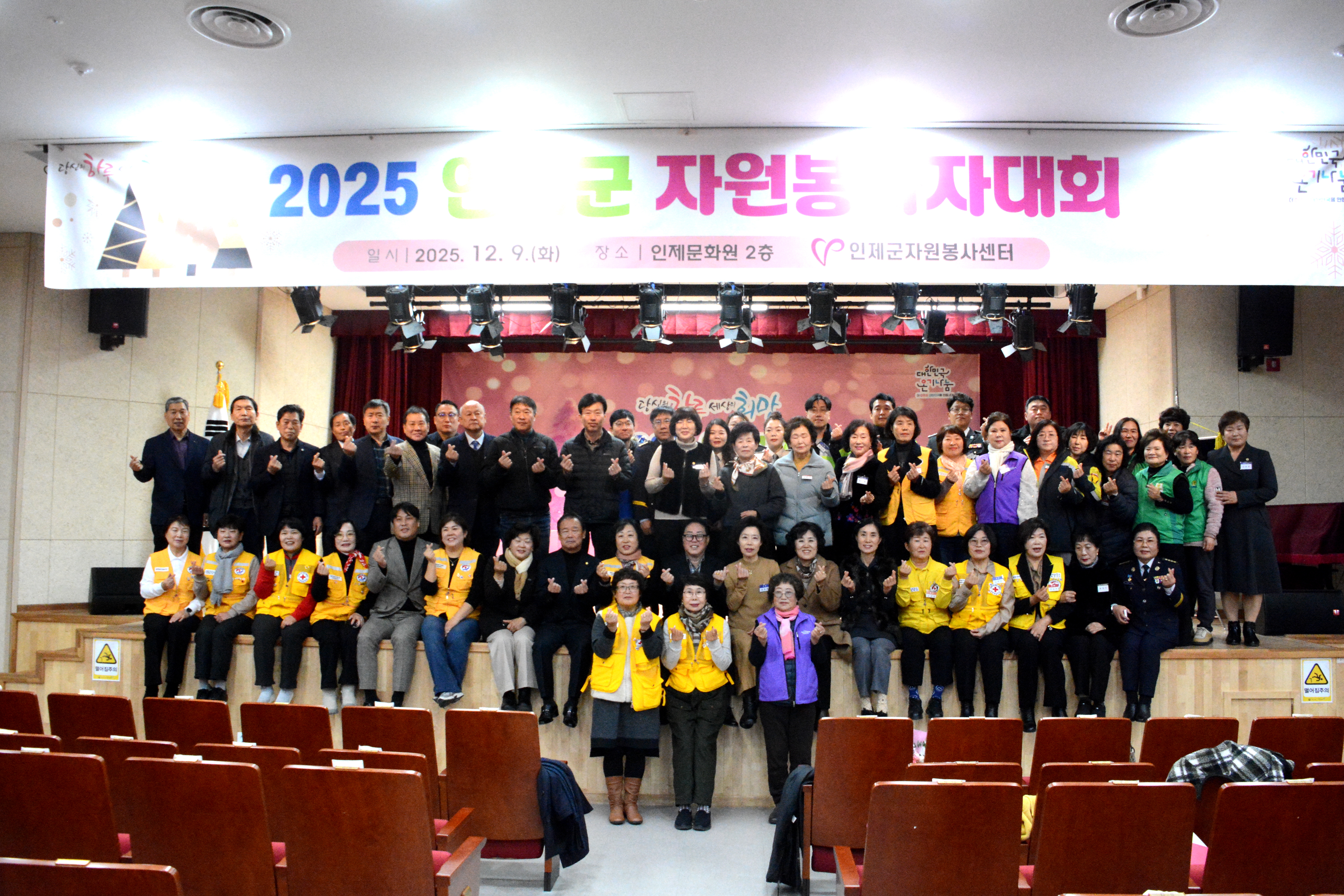 2025 인제군자원봉사자대회가 12월9일 11:00에 인제문화원 공연장에서 개최되었다. 인제군자원봉사센터(센터장 이영자)에서 주관하는 이번 행사에는 최상기 인제군수, 이춘만 인제군의회 의장, 송근직 강원도센터장 및 관내 유관기관 및 사회단체, 자원봉사단체 회원이 참석한 가운데 개최됐으며, 자원봉사 유공자에 대한 표창장 수여식, 자원봉사활동 영상 상영 등이 진행됐다. 이날 행사에는 봉사왕, 금장, 은장, 동장(총60명)의 인증서 수여 및 자원봉사유공 포상자로 강원도지사 표창 5명, 인제군수 표창 8명, 인제군의회 의장 표창 4명 등 총24명의 수상자들이 함께하였다. 이영자 센터장은 “자원봉사자들의 활동이 관내 홀로 계시는 어르신, 어려운 이웃 등 도움의 손길이 필요한 곳곳에서 묵묵히 따뜻한 온정을 전하며 ..